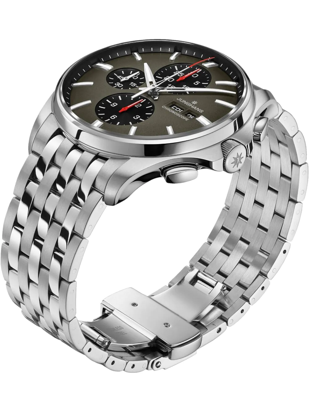 This Junghans watch has a 45 mm stainless steel case that houses a Automatic Junghans J880.1 movement. The watch is fitted with a stainless steel strap and is 20 ATM water resistant.