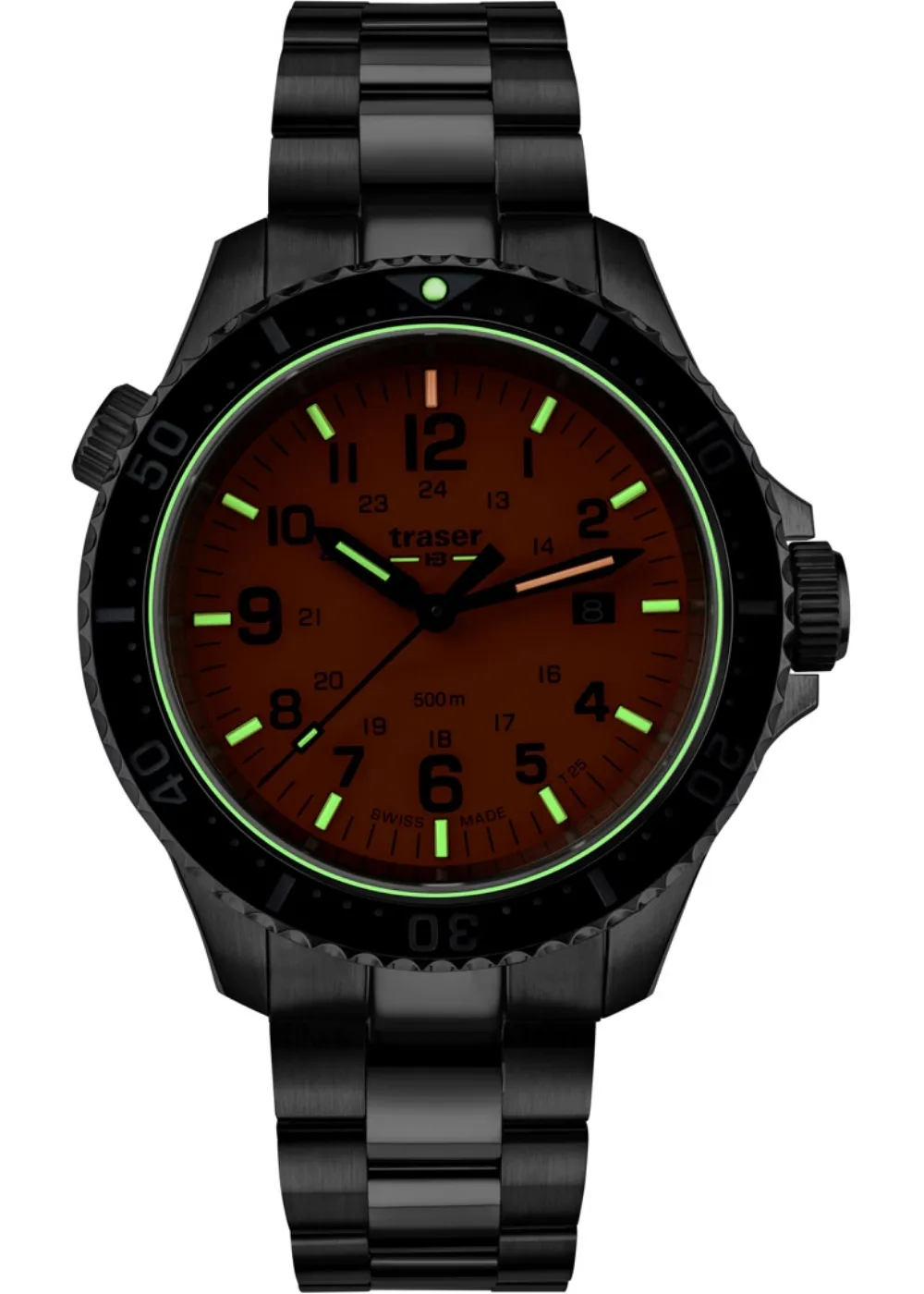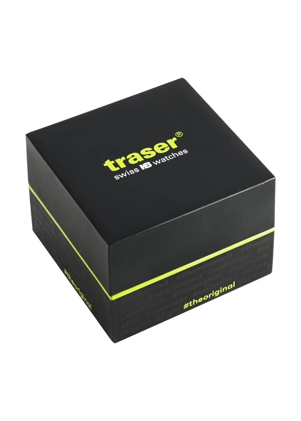 This Traser H3 watch has a 46 mm stainless steel case that houses a precise Swiss Made quartz movement. The watch is fitted with a stainless steel strap and is 50 ATM water resistant.